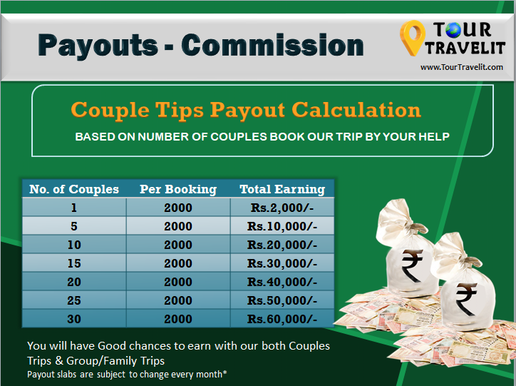 Example – If you sell a Couple Trip (2 person), you will get Rs.2000/- commission. It will be like Rs.1000 per person, for Two couples Trip booking ( 4 person), you will get Rs.4000/- as commission.